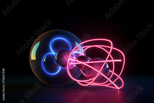 Science and technology concept. Abstract and surreal atom model colorful lightning trails and visualization in dark background with copy space. Neon colored vivid light