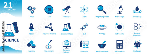 Science icon. Set of icons for experiment, astronomy, DNA, medical, microbiology, hydrology, chemistry. Solid vector icons