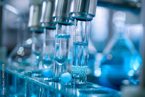 Science laboratory research and development concept. Microscope with test tube in science learning and experiment environment.