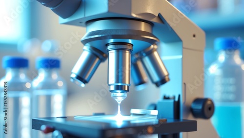 Scientific background with closeup on light microscope and blurred laboratory