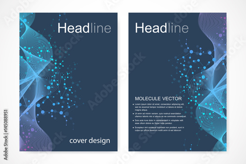 Scientific brochure design template. Vector flyer layout, Molecular structure with connected lines and dots. Scientific pattern atom DNA with elements for magazine, leaflet, cover, poster design.
