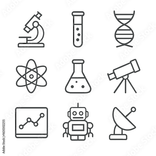 Scientific Icons Grid. Outline icon set of scientific exploration: microscope, test tube, DNA strand, atom, laboratory flask,