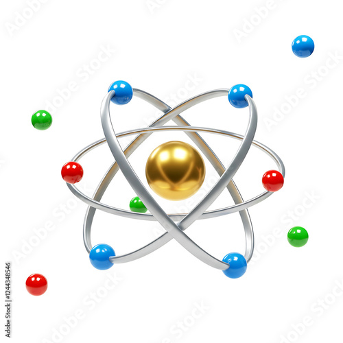 Scientific Illustration of an Atom with Metallic Sheen and Orbiting Electrons