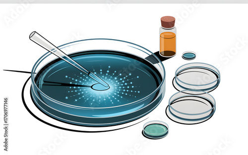 Scientific Research Illustration Petri Dish with Bacteria Culture, Pipette, and Sample Vials for Laboratory Experimentation