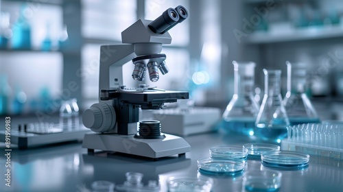 scientific research, laboratory setting with microscope and petri dishes, ideal for scientific background with room for text