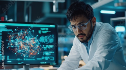 Scientist Analyzing Data in High-Tech Laboratory with Computer Screen