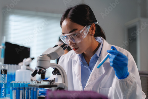 Scientist analyzing sample with microscope in laboratory research