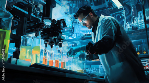 Scientist conducting experiment in a modern laboratory, using advanced equipment and chemicals.
