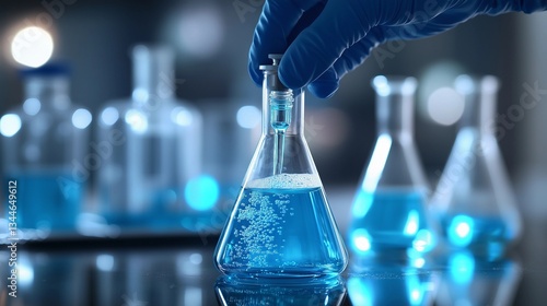 Scientist conducts experiment with blue liquid in laboratory during nighttime research