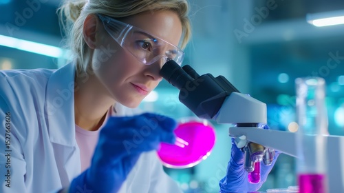Scientist examines petri dish under microscope in laboratory setting during evening hours