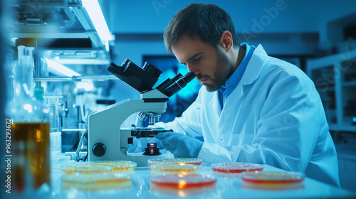Scientist Examining Samples Under A Microscope In A Lab. Blue And White Tones. Medical Research, Science, Laboratory.