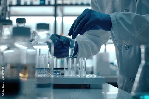 Scientist holding test tubes for test and view of Laboratory equipment microscope