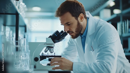 scientist in a lab coat analyzing samples under a microscope in a modern laboratory, copy space