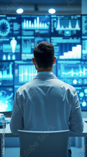 scientist in a lab coat is reviewing complex data charts and graphs on multiple monitors