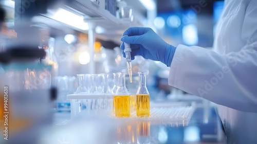 Scientist in a Lab Using a Pipette to Transfer Liquid Into a Glass Flask