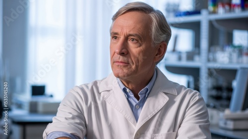 Scientist in a laboratory wearing a white lab coat, looking thoughtful.