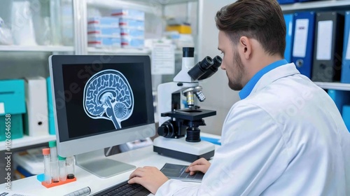 Scientist in lab coat analyzing brain scan on computer screen, surrounded by research papers and microscope, emphasizing focus on autism research and medical advancements.