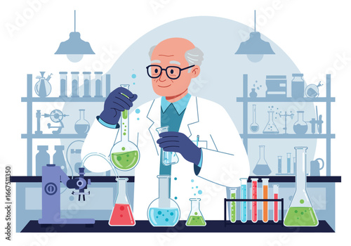 Scientist in Lab Coat Conducting Experiment with Glassware and Liquids.