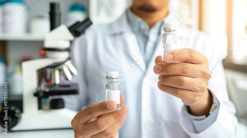 Scientist in lab coat holding vial of experimental drug, withmicroscope and scientific eauipment, symbolizing drug trials and medical researchprocess.