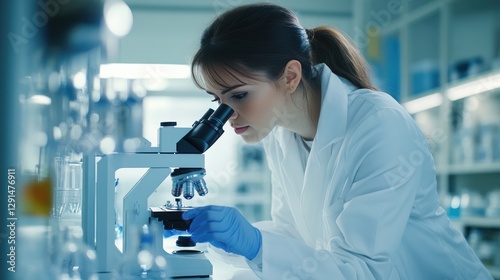 Scientist is looking through a microscope and taking notes, background