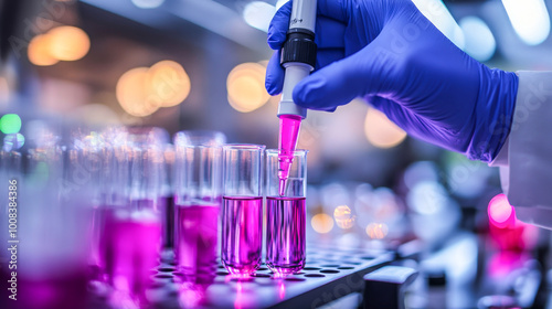 Scientist is working with a pipette and test tubes in a laboratory, transferring a purple liquid for an experiment