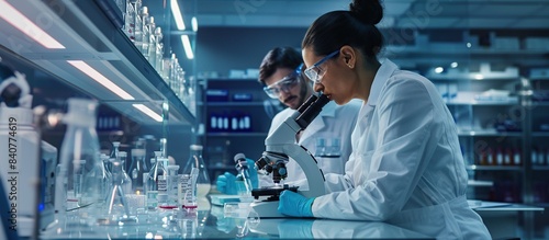 Scientist researcher using microscope in laboratory. Medical healthcare technology concept.