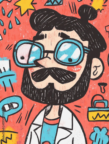 Scientist with glasses and a mustache creative workspace illustration vibrant color palette close-up whimsical character design