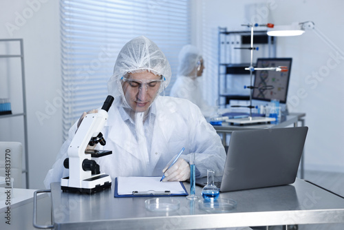 Scientist with laptop and microscope working at table in laboratory