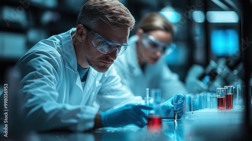 Scientist working in a lab with test tubes and chemicals