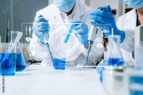 Scientists in a high tech lab conduct research with pipettes and tablets, blending medical innovation, data science, and futuristic digital healthcare technology.