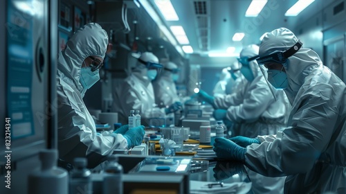 Scientists in full protective gear work diligently in a high-tech laboratory, focusing on advanced research and safety protocols.