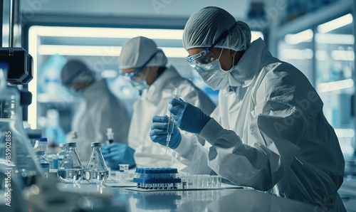 Scientists in lab analyzing viruses and samples in a research setting. Free copy space for banner.