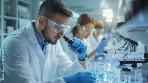 Scientists in lab coats conducting experiments with microscopes and test tubes.