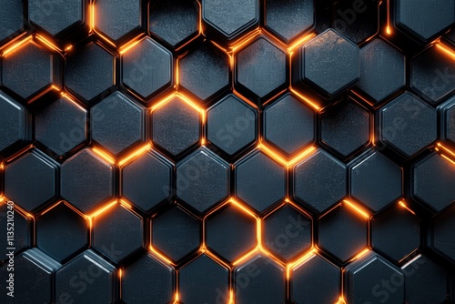 Sci-fi building facade, 3D render, hexagon block wall, metallic and glass materials, glowing lights, futuristic city