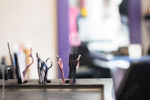Scissors and combs on a hairdresser's trolley with a window in the background. Copy space.