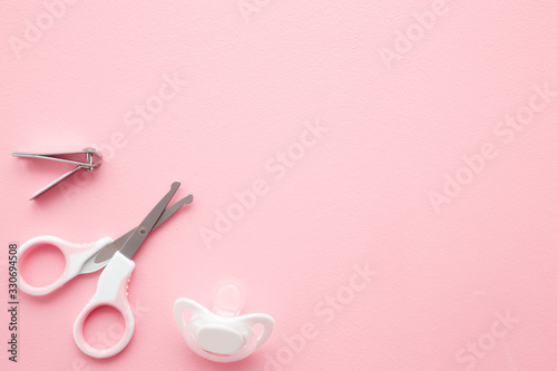 Scissors, clipper and soother on light pink table. Pastel color background. Simple tools for baby nail cutting. Empty place for text. Closeup. Top down view.