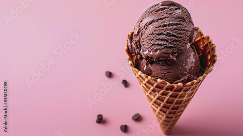 Scoop of chocolate ice cream with chocolate sauce on isolate pink color background