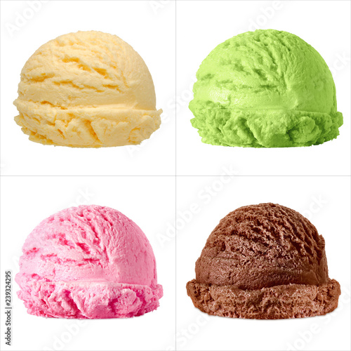 scoop of strawberry, mint, chocolate and mango ice cream in bowl isolated on white background