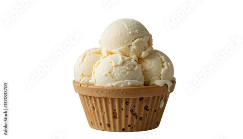 scoops of creamy vanilla ice cream in brown paper cup