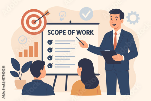 Scope of work presentation. Project manager explaining sow document and business strategy. Businessman planning tasks and defining goals for the team. Project management concept.