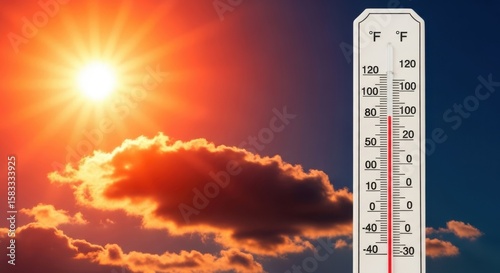 Scorching sun and high temperature reading on thermometer indicate heatwave
