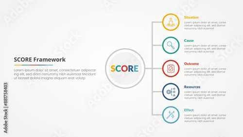 score model infographic concept for slide presentation with vertical stack list on circle outline with 5 point list with flat style