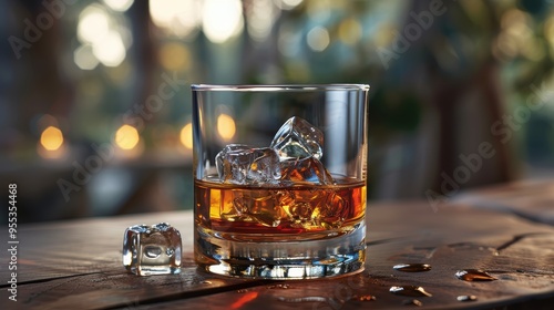 Scotch Whiskey on Rustic Table, A glass filled with amber scotch whiskey and ice cubes sits on a weathered wooden table, blurred background