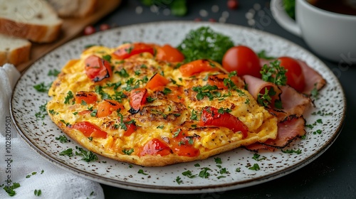 Scrambled eggs omelet with grilled bell sweet pepper and hot smocked chicken ham in a plate with a cup of coffee and bread on a white background : Generative AI