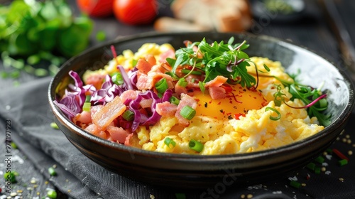 Scrambled eggs with bacon, red cabbage, and greens. This image is perfect for promoting a healthy breakfast option.