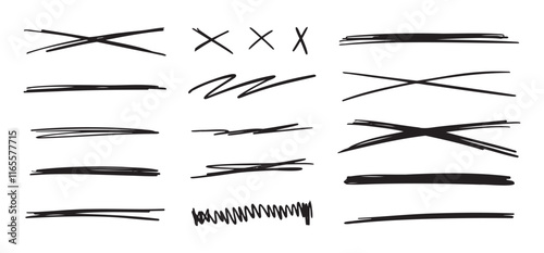 Scribble doodle underlines set. Underline and cross markers collection. Doodle lines isolated on white background.