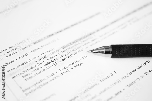 Script code on paper and pen, closeup. Software development concept