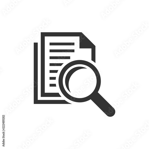 Scrutiny document plan icon in flat style. Review statement vector illustration on white isolated background. Document with magnifier loupe business concept.