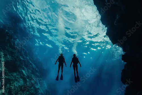 Scuba Diving Couple in Deep Blue Ocean Depths, Tagging Style with Lively Action