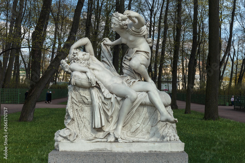 Sculptural composition of the Summer Garden " Cupid and Psyche". Copy. Old Public park "Summer Garden" in St. Petersburg, Russia